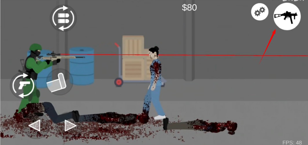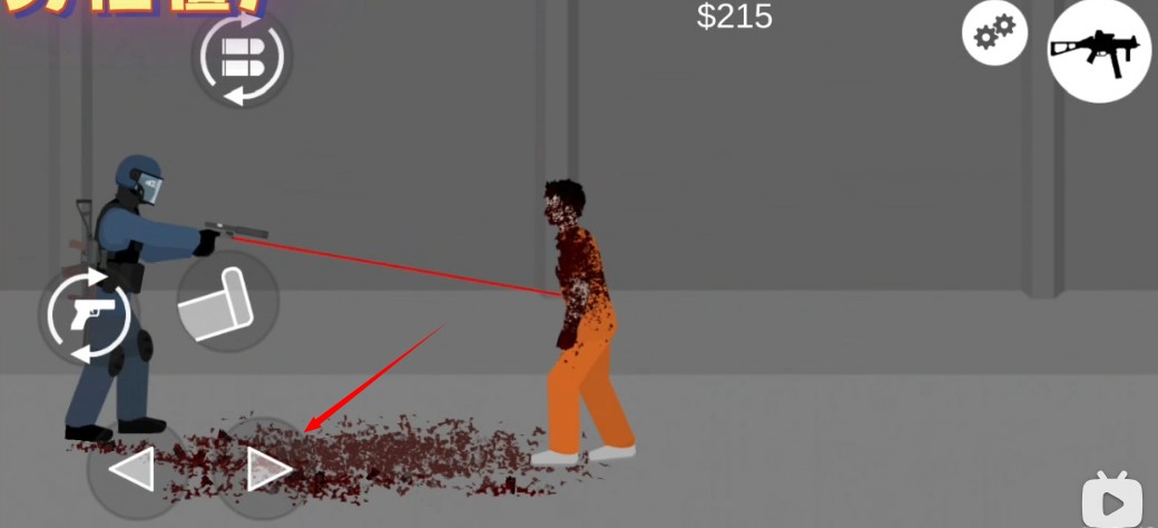 1、游戏界面的左边是控制玩家左右移动的方向键,切换武器按键,还有踢腿攻击按键