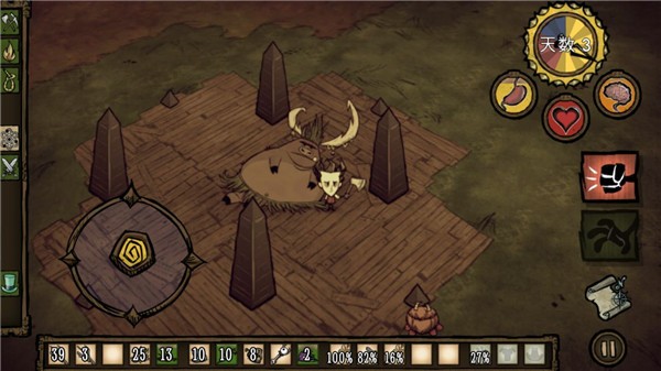 1、生命值、饥饿值、脑残值一开始都是满的。这个时候玩家是最省心的,不会有天灾,没有野狗和Boss。