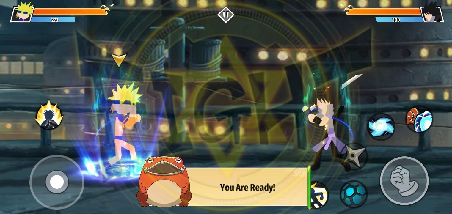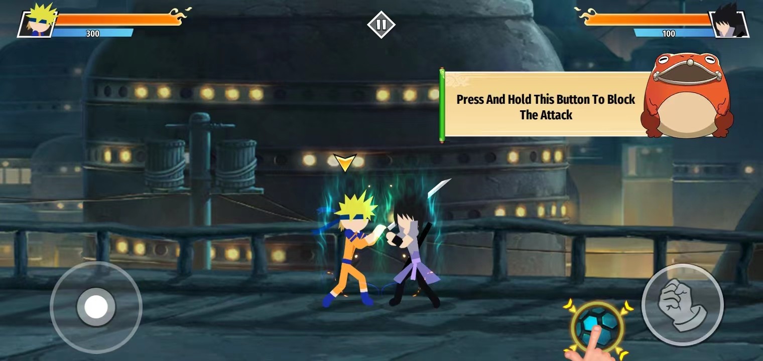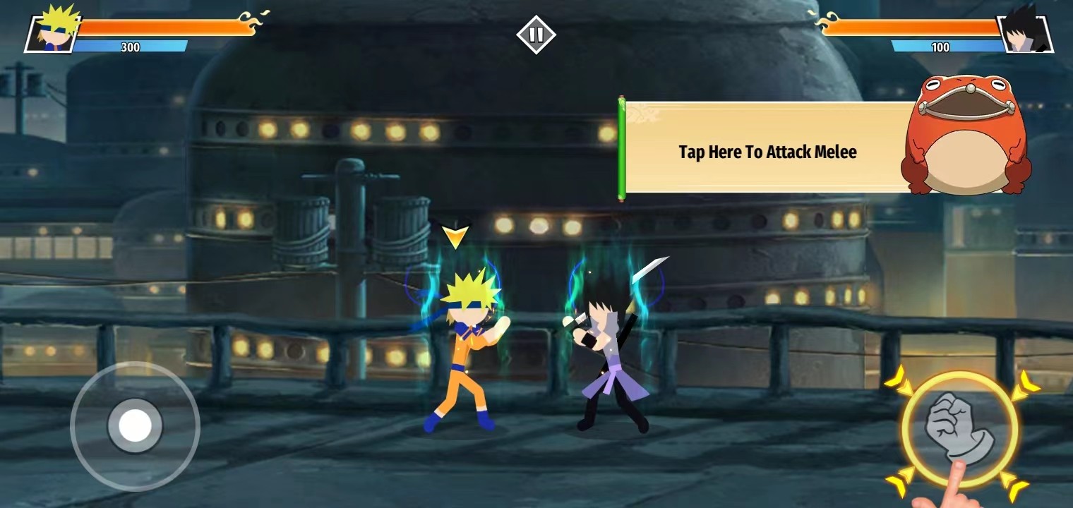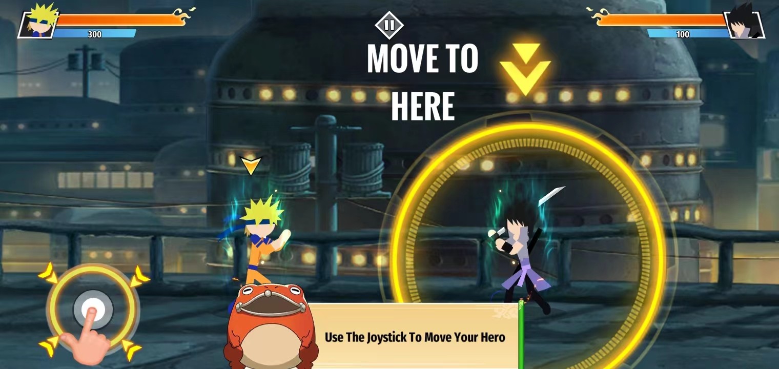 1、首先,玩家在本站下载并安装好火柴人忍者大战游戏,打开进入;一进来就会进入战斗界面演示,玩家可以根据对话的指示,更快上手游戏;点击左方的按钮进行移动,靠近对手;