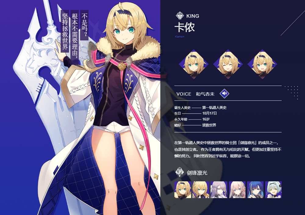 从诞生于第一轨道「剑锋凛光」的荣耀战士,到第二轨道「千紫」的神秘巫女,再到第八轨道「零射橙」的元气少年,在此邂逅形形色色的「骑士」,编织属于你们的羁绊吧!