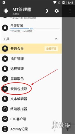 1、进入Mt管理器,点击页面左上角的选项按钮,并选择“安装包提取”。