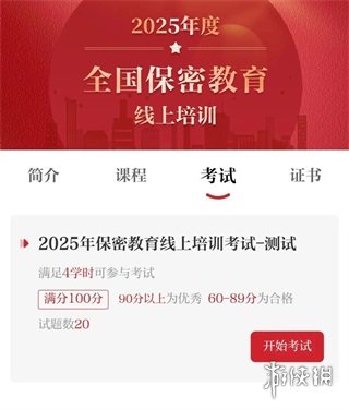 完成4个学时的学习后,可以点击“考试”选项,再选择“开始考试”,考试时长为30分钟,共有25道题目,其中包括20道单选题和5道判断题。考试成绩满分为100分,达到90分即为优秀,60分则为合格。