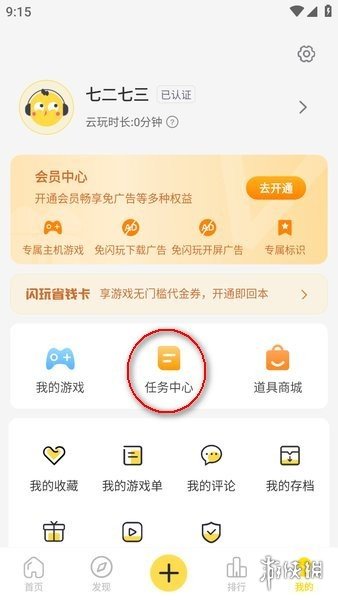 启动闪玩应用后,请先点击右下角的“我的”并登录您的账号,接着进入“任务中心”。