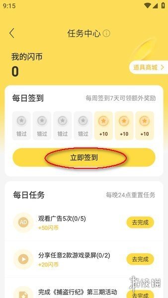 在任务中心内,点击“立即签到”即可获得闪币奖励,连续签到7天还将解锁额外奖励。