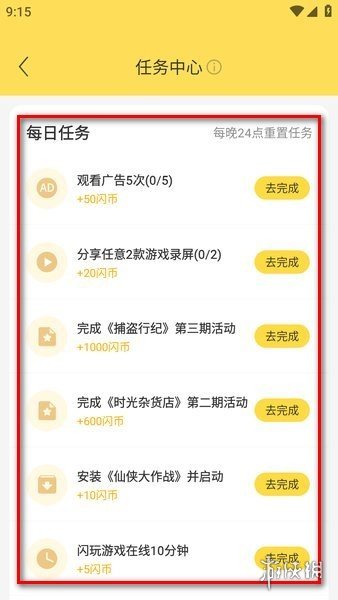 此外,“每日任务”板块还包含了观看广告、分享游戏录屏、以及游戏在线满10分钟等任务,完成这些任务同样可以获得闪币。