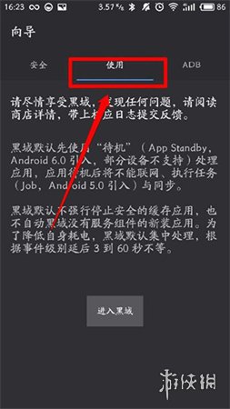 4、在“使用”选项卡中,点击“进入黑阈”按钮。