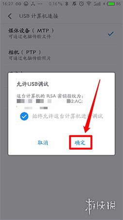 8、连接成功后,手机会弹出“允许USB调试”的提示框,点击“确定”进行确认。