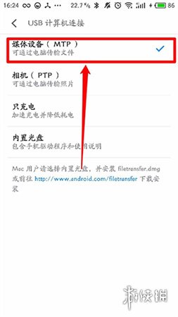 7、使用USB数据线将手机连接到电脑,同时将手机连接模式设置为“媒体设备(MTP)”。