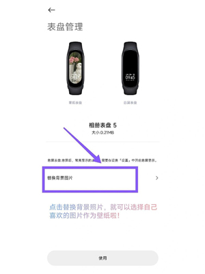 3、选定表盘后进入详情页,点击替换背景图片,确认使用新壁纸。