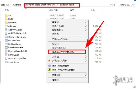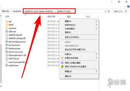 11、接着,打开电脑中ADB文件目录(注意图中的目录路径),在空白处按住键盘上的“shift键”,然后点击鼠标右键。