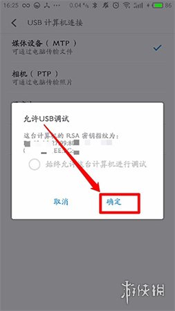 9、然后,手机会弹出“允许USB调试”的提示框,点击“确定”按钮。