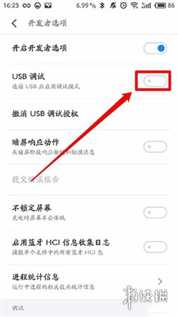 6、进入“开发者选项”后,点击开启手机的“USB调试”。
