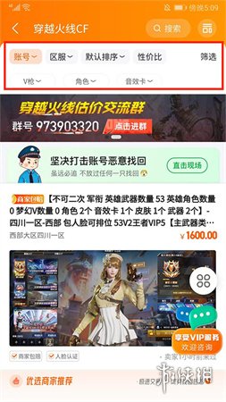 2、进入穿越火线CF账号界面后,你可以根据需求筛选道具类型、区服、性价比、角色、V枪等条件,并点击你喜欢的商品。
