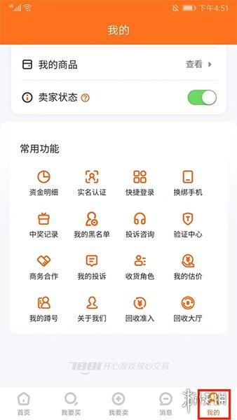 1、打开7881游戏交易平台,可以看到包括首页、我要买、我要卖、消息和我的在内的几个功能。