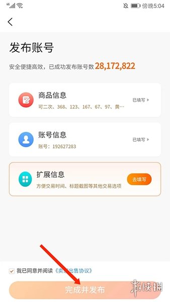 3、依次填写完商品信息、账号信息和扩展信息后,选择下方【完成并发布】即可进行发布出售。