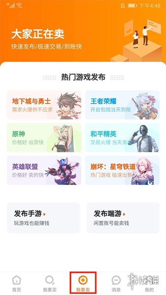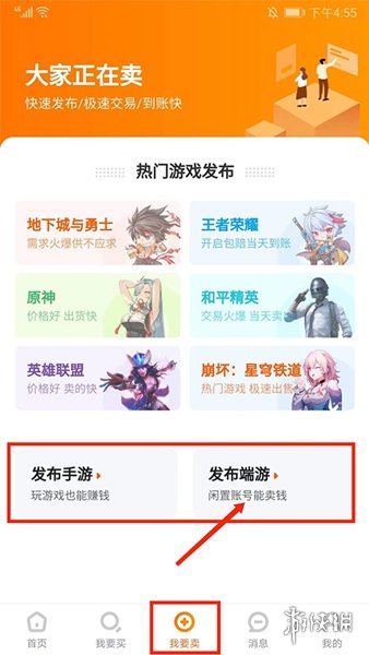 4、在【我要卖】界面,用户可以选择发布手游或者端游的账号信息进行出售。